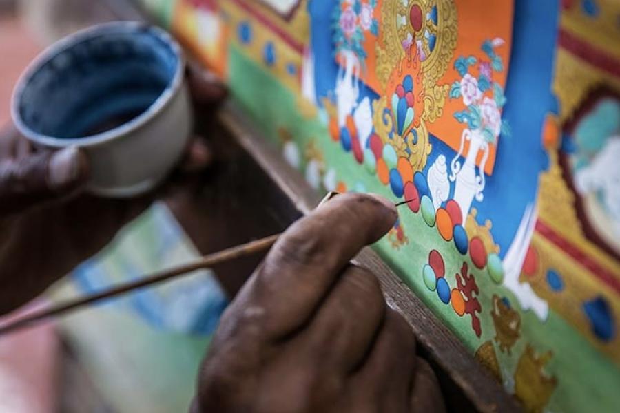 英州彭措有著一份山裏孩子特有的自在和喜悅。十余歲的他在親友的介紹下來到毗鄰的壤塘縣,到向往已久的唐卡傳習所,看看自己是否能夠有緣學習。自那開始迄今已有十個春秋,跟隨嘉陽樂住仁波切的三千個日夜中,他已經成長為一名具格的唐卡畫師,嫻熟於菩薩低眉與金剛怒目,又在天地間描繪山水的勃勃生機,不變的是那份童心,成長的是那份自在和喜悅。